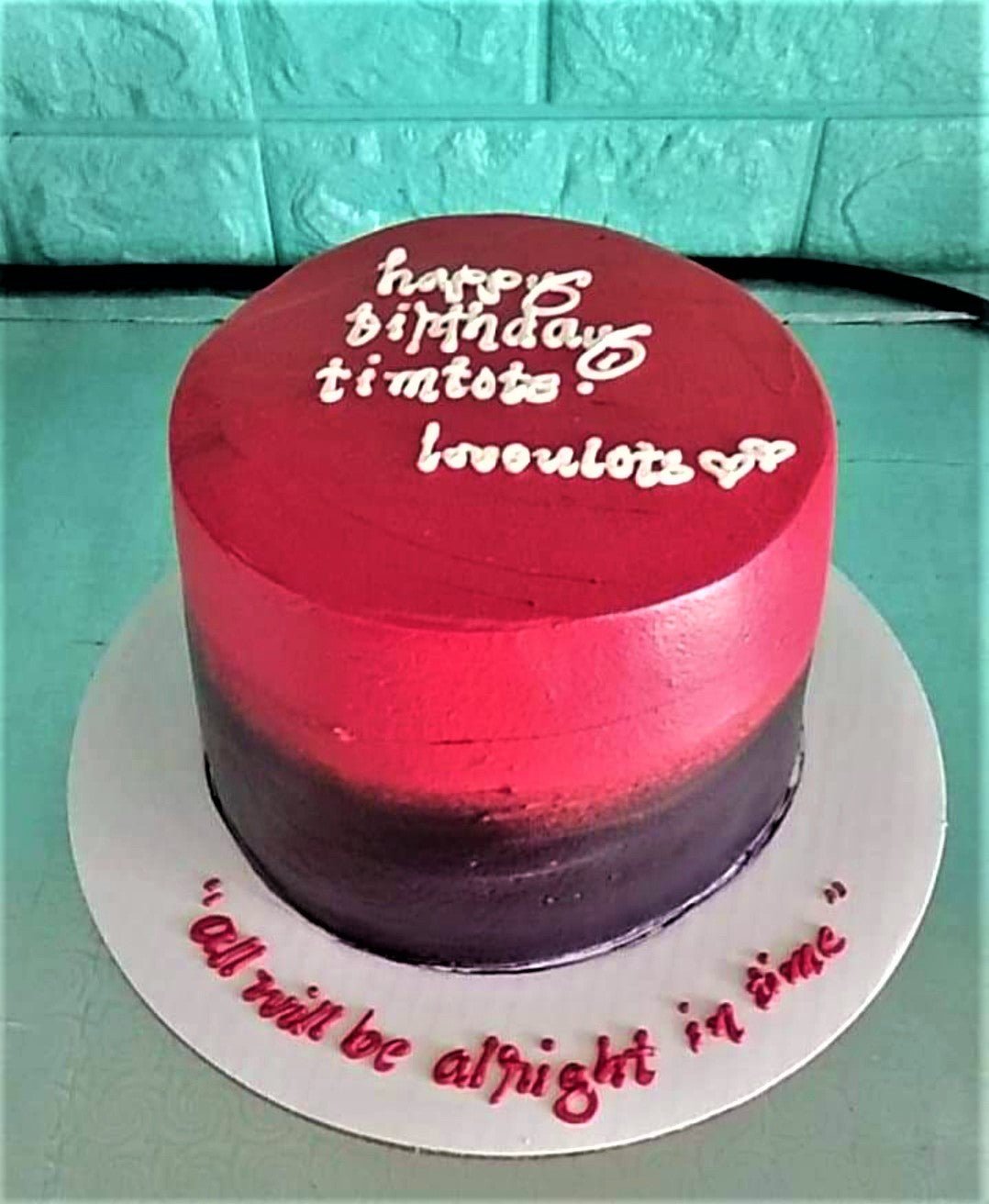 A minimalist red and dark purple gradient cake with white icing text on top and red icing text on the base board.