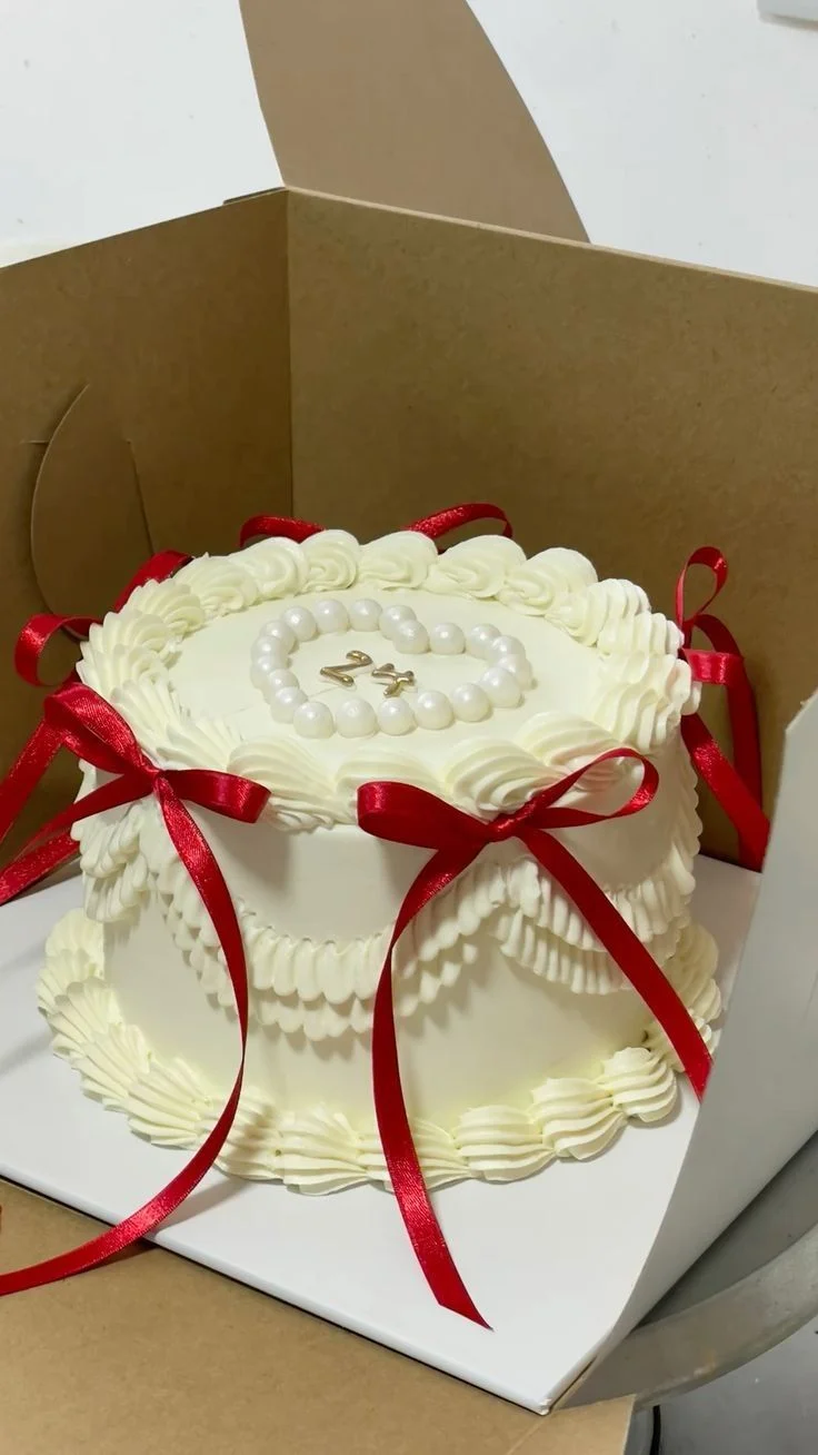 White minimalist vintage cake with red satin bows, piped cream ruffles, and a pearl heart with gold number 24 on top.