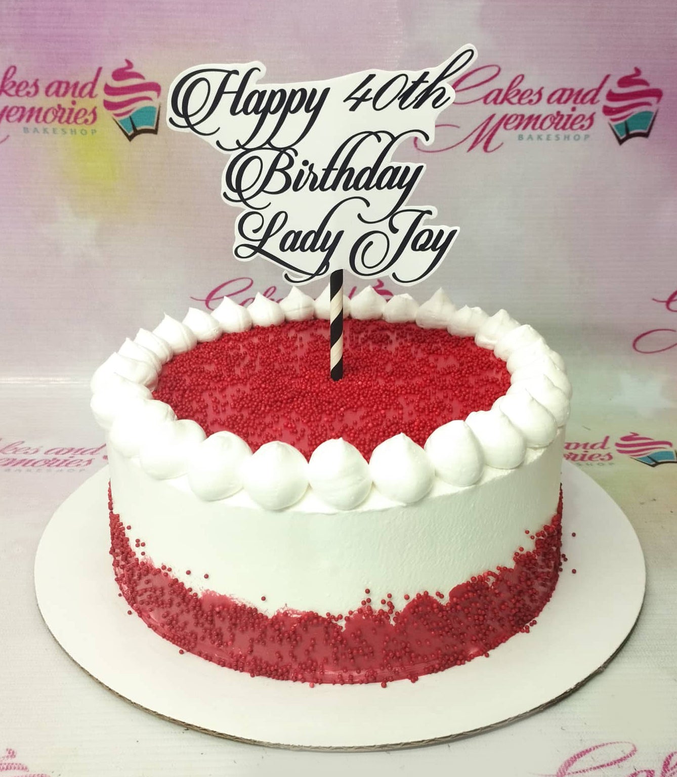 White round cake with red sprinkles on top and bottom edge, featuring a large black and white Happy 40th Birthday Lady Joy topper.