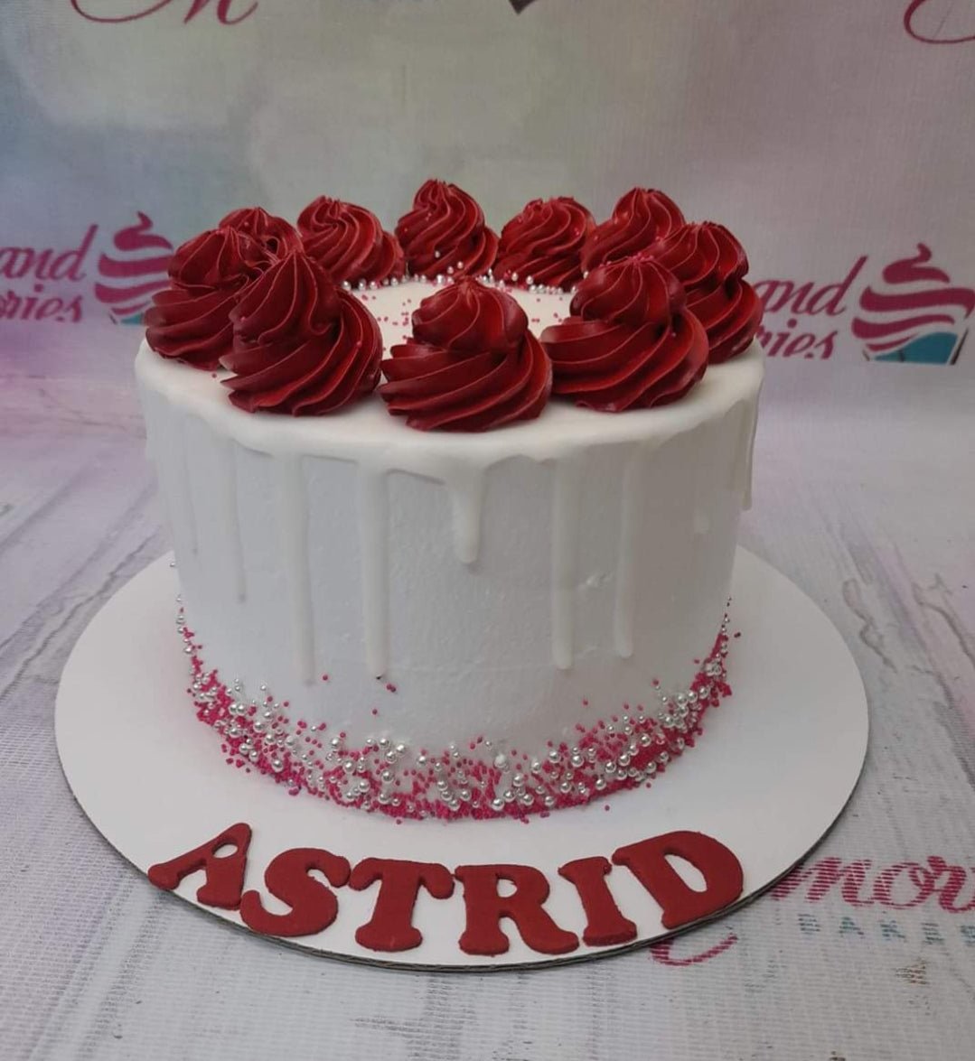 White minimalist cake with deep red icing rosettes, white chocolate drip, and silver and pink sprinkles at the base.
