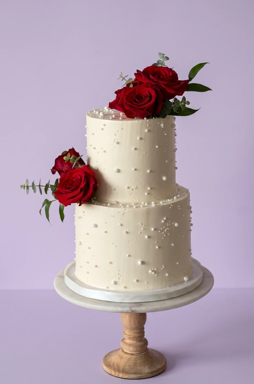 Elegant ivory two-tier cake decorated with fresh red roses and white edible pearls on a marble stand.