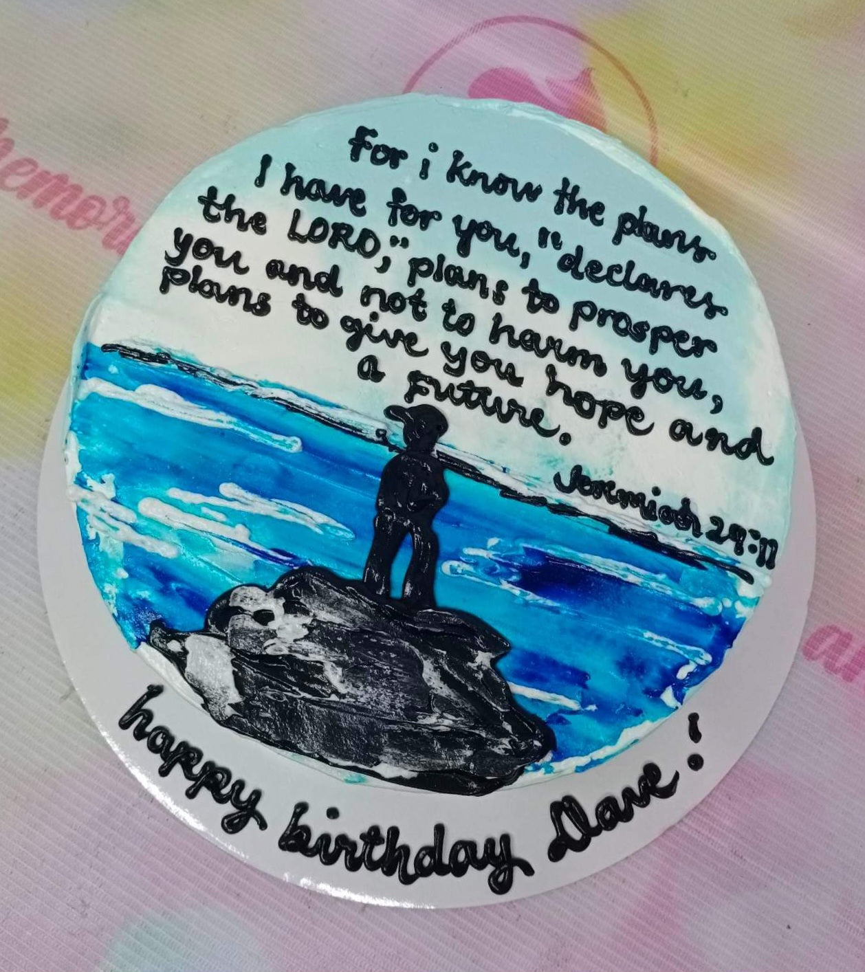 Round white cake with a hand-painted blue ocean scene, a silhouette of a person fishing, and a Bible verse from Jeremiah 29:11.
