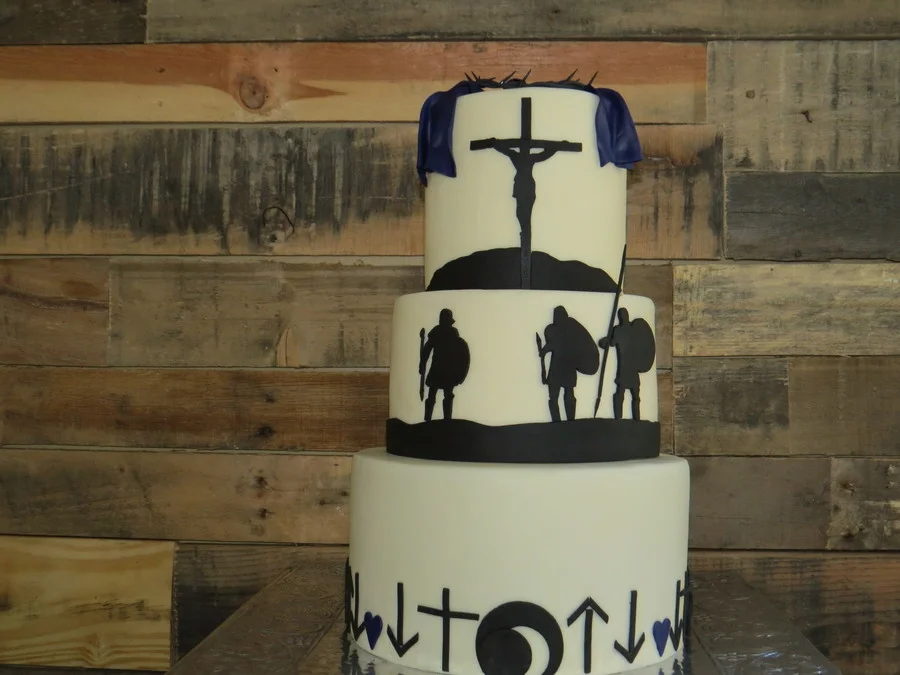 Three-tier white fondant religious cake featuring black silhouettes of the crucifixion and Roman soldiers with purple fabric accents.