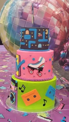 Vibrant 3-tier 80s and 90s retro themed cake with Pac-Man, MTV logo, roller skates, and cassette tape decorations.