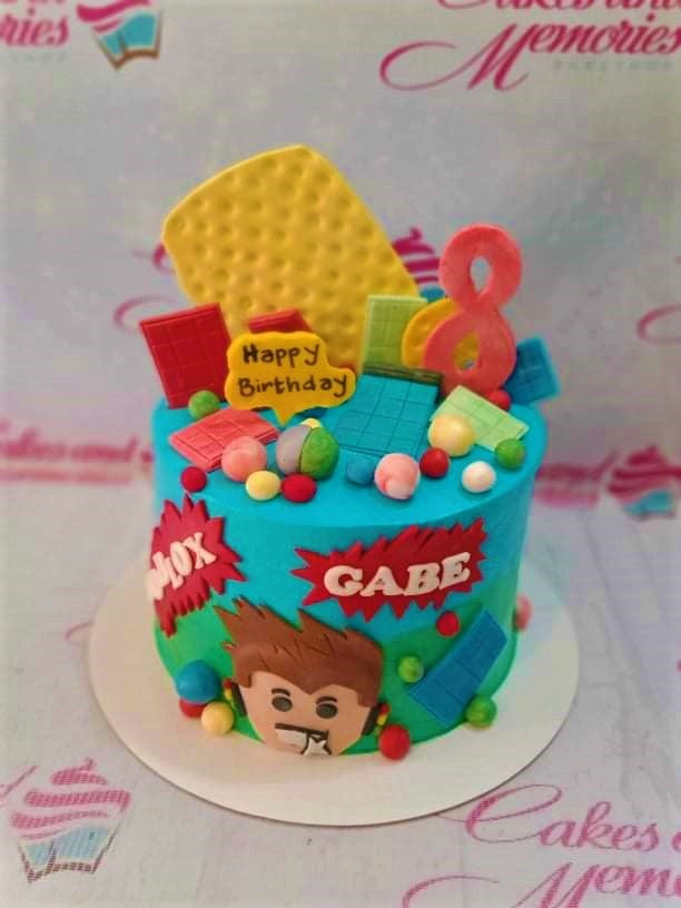 Roblox themed birthday cake with blue and green icing, featuring a character face, colorful blocks, and a red number 8 topper.