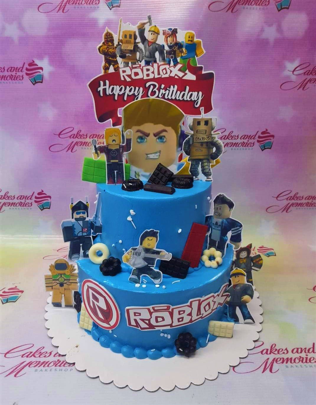 Blue 2-tier Roblox themed birthday cake with various character printouts and chocolate bar decorations.