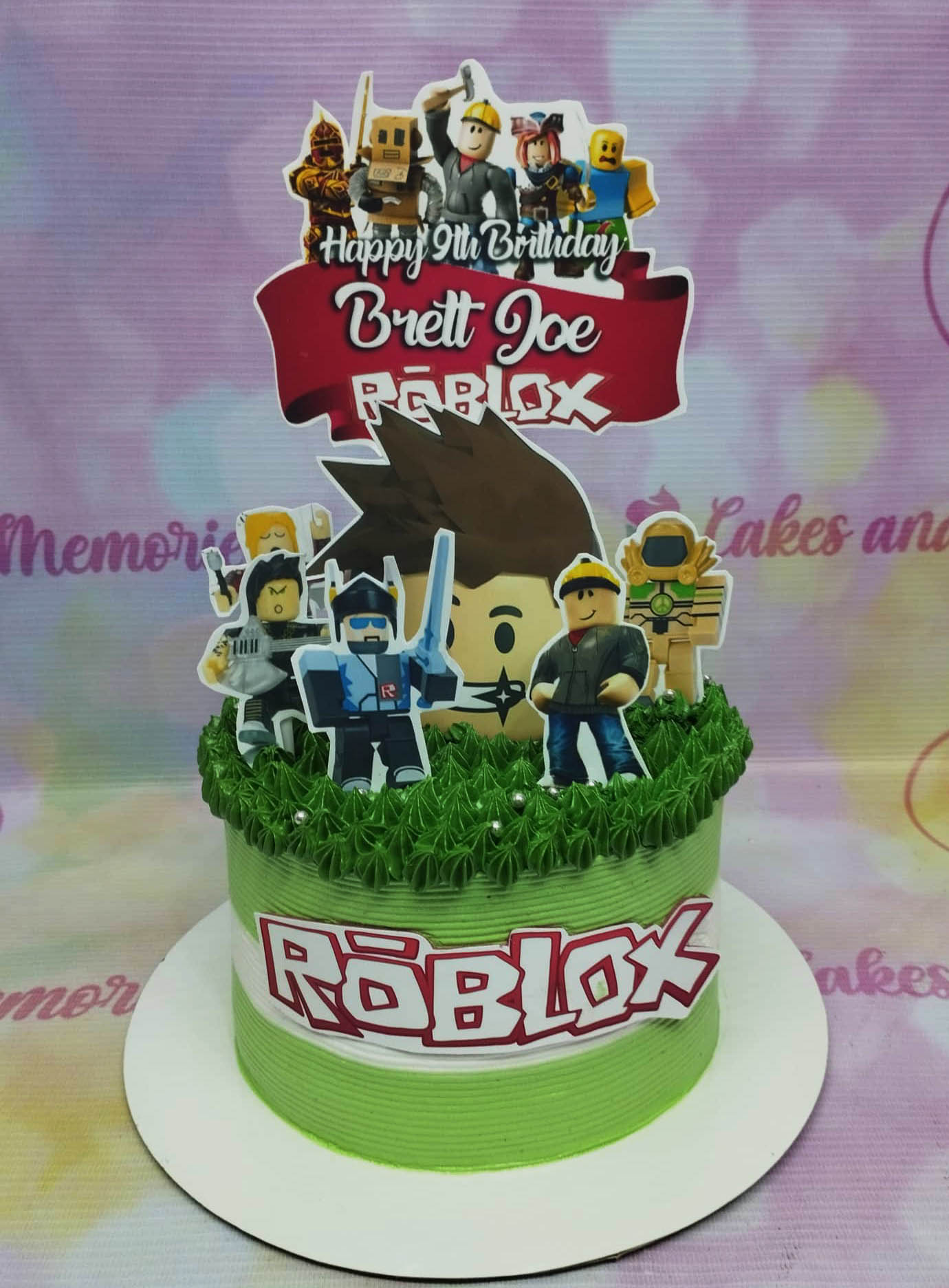 Green Roblox themed birthday cake with grass-like icing and character printouts for Brett Joe's 9th birthday.