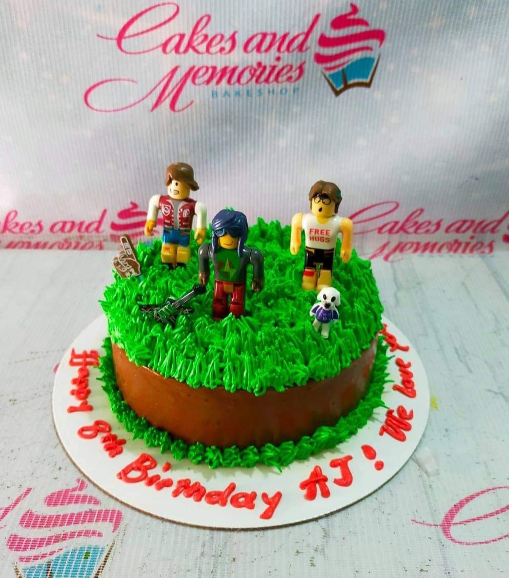 Roblox themed birthday cake with green grass icing, brown sides, and three character toy toppers on a white base board with red icing text.