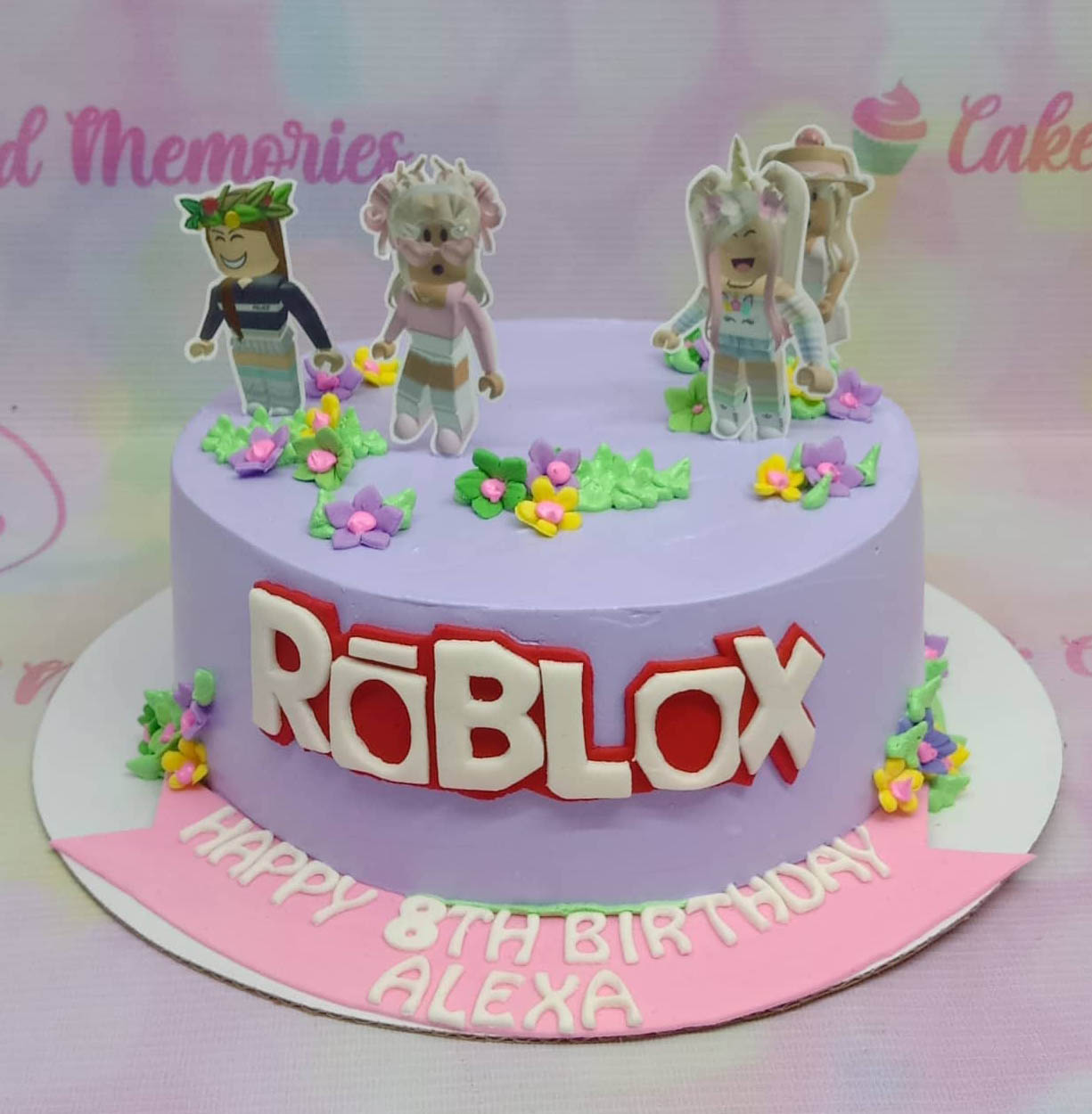 Purple Roblox themed birthday cake with character printouts, fondant flowers, and a pink banner for Alexa's 8th birthday.
