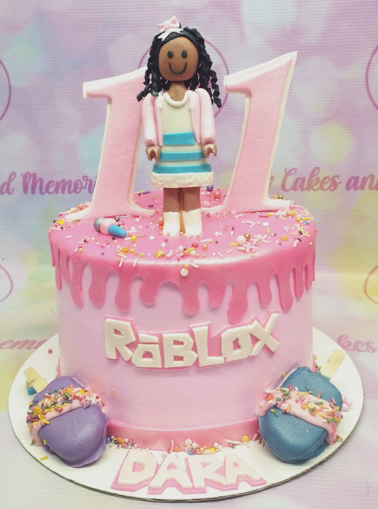 Pink Roblox themed birthday cake for Dara's 11th birthday featuring a custom fondant girl figure and pink icing drip.