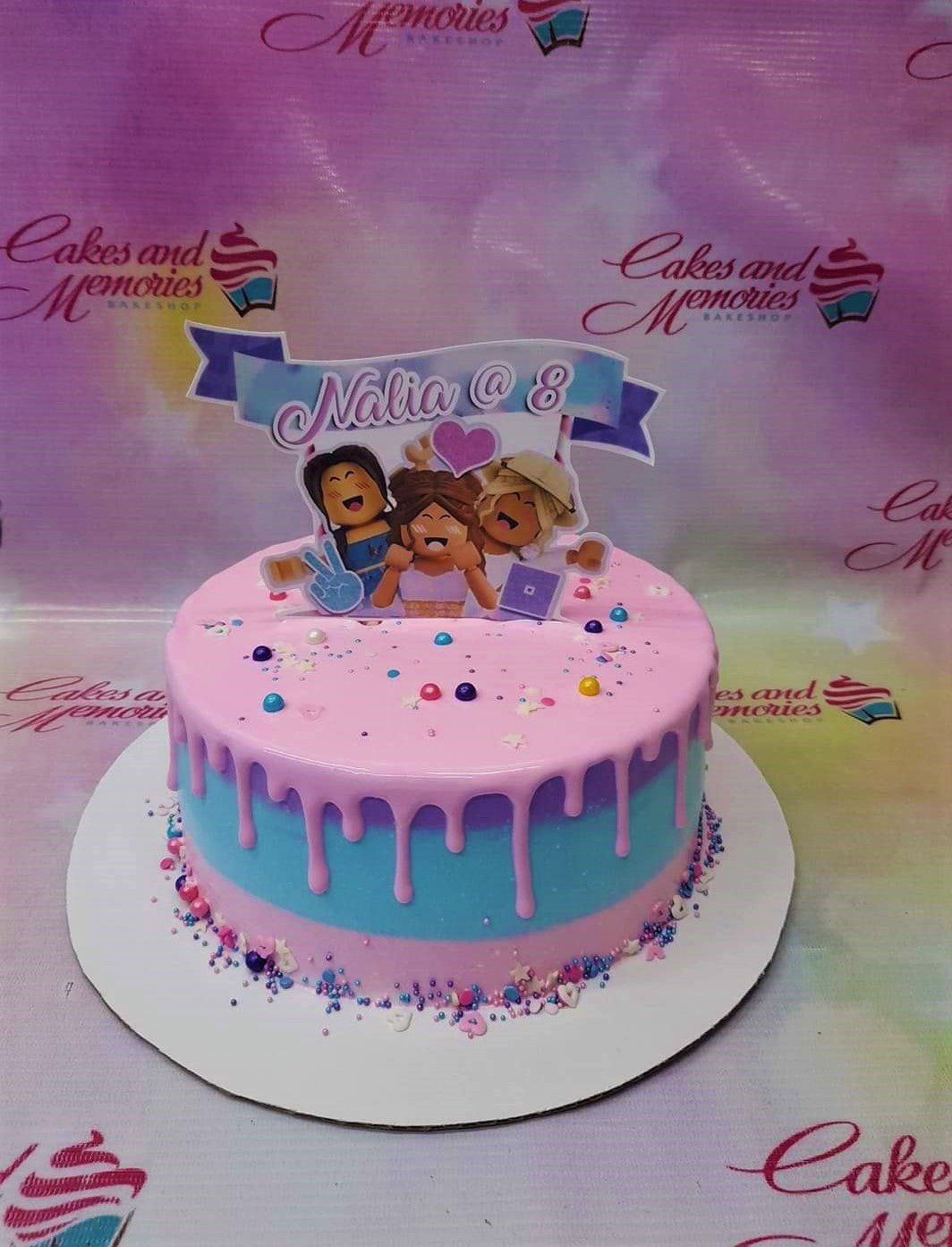Pink and blue Roblox themed birthday cake with a pink drip and colorful sprinkles for Nalia's 8th birthday.