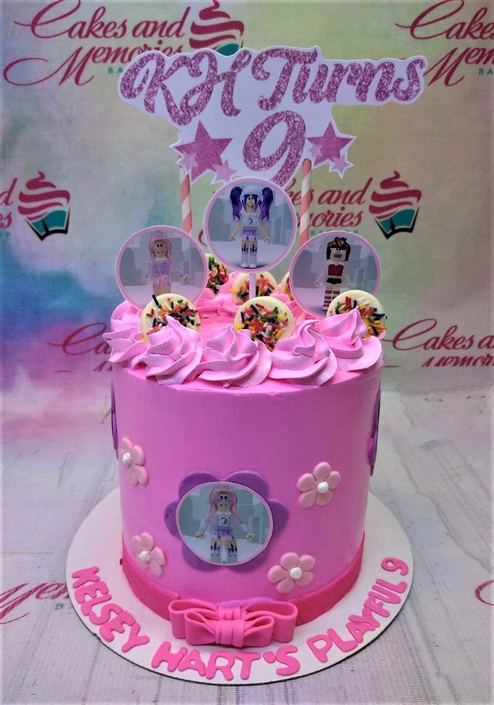 Pink Roblox themed birthday cake with character printouts, pink icing rosettes, and a glittery KH Turns 9 topper.