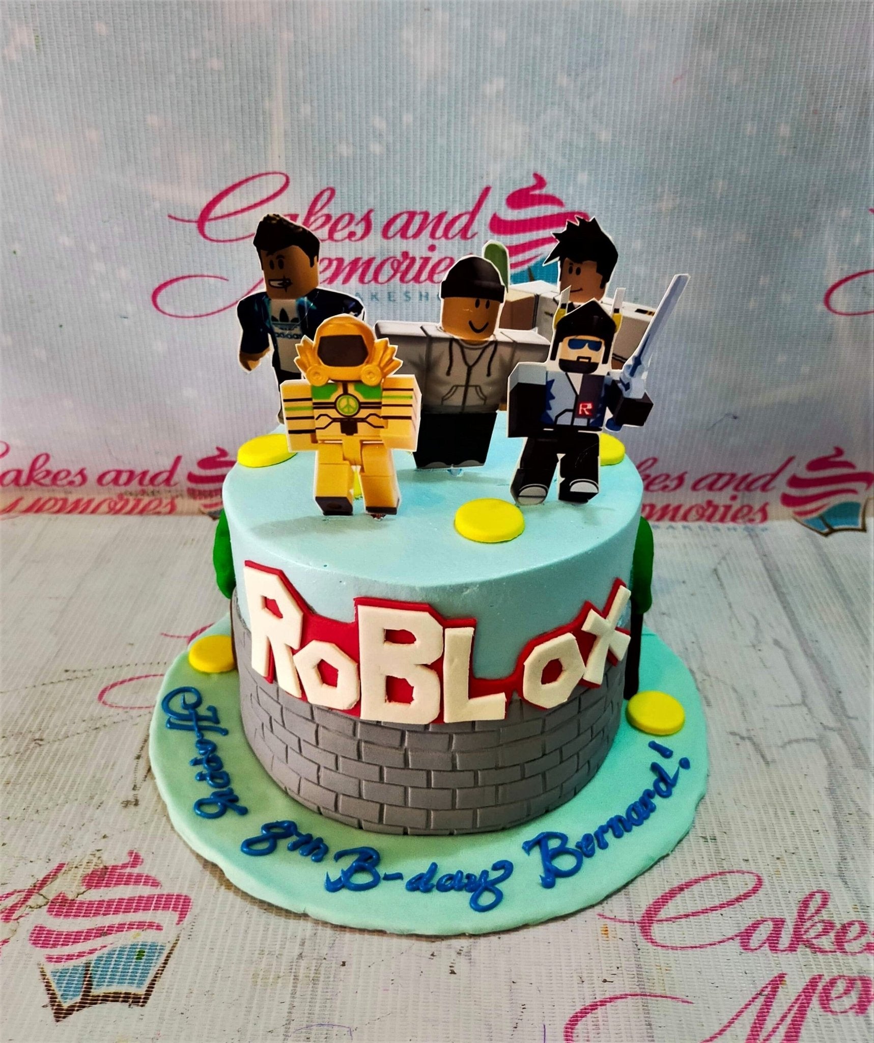 Roblox themed birthday cake with light blue icing, grey brick pattern, and various character printouts on top.