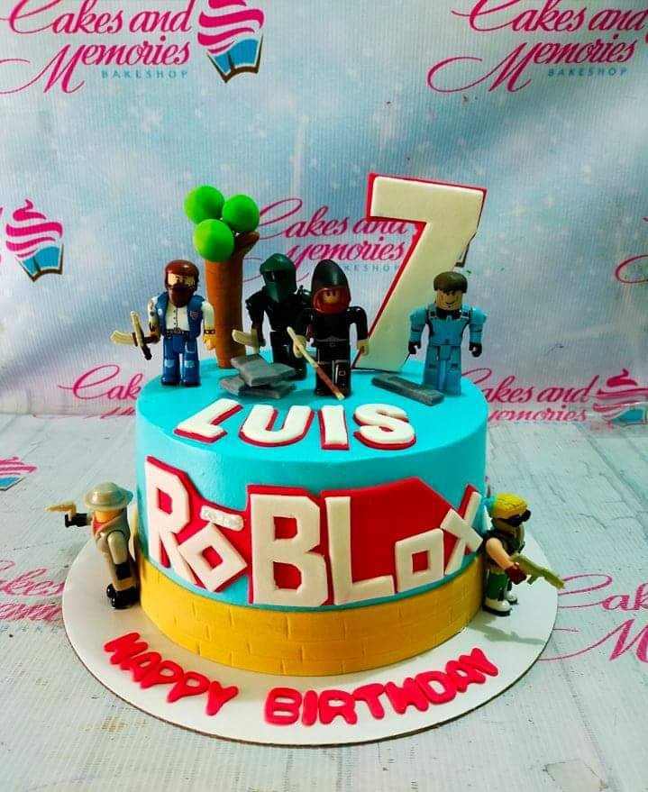 Blue and yellow Roblox themed birthday cake with 3D character figures, a large number 7, and a brick pattern base.