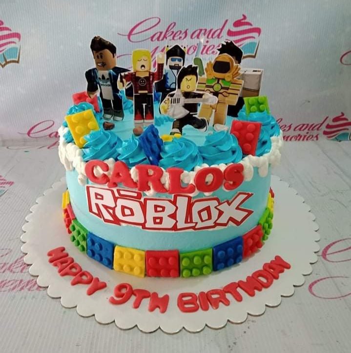 Blue Roblox themed birthday cake with Lego block decorations and character toppers for Carlos's 9th birthday.