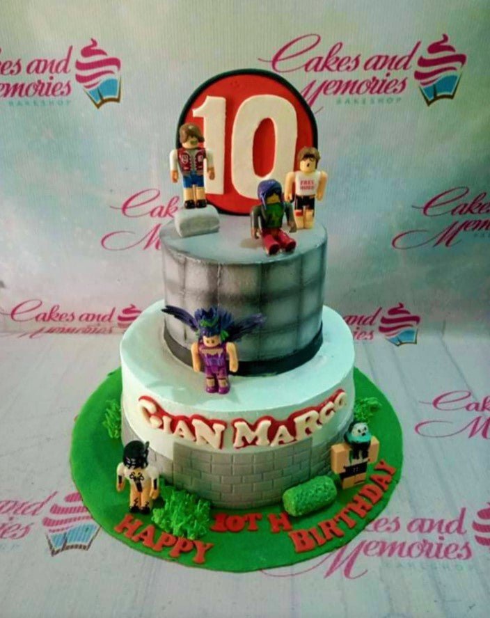 Two-tier Roblox themed birthday cake with gray brick and white fondant tiers, featuring multiple character figurines and a large number 10 topper.