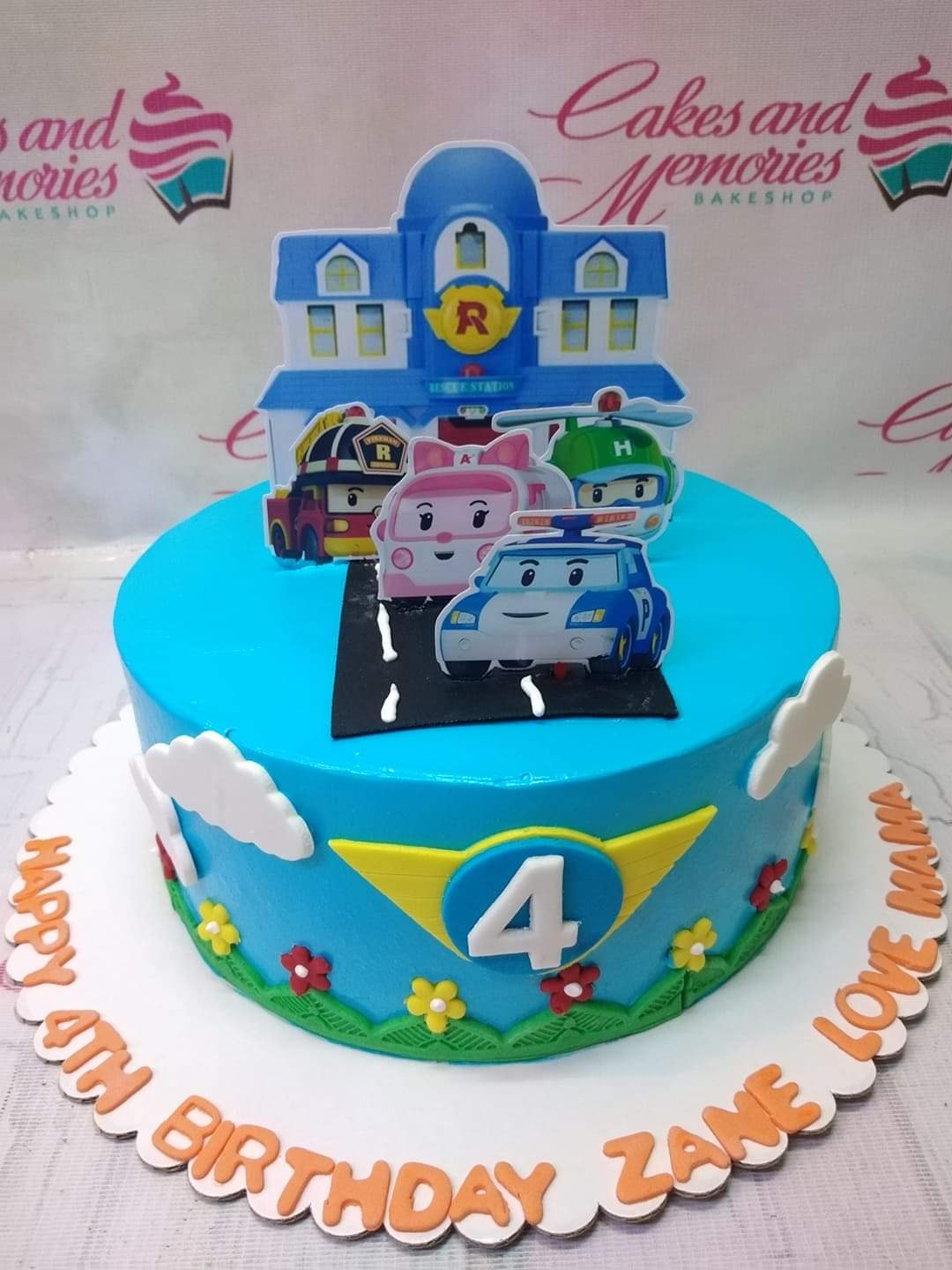 Blue Robocar Poli themed birthday cake with character printouts, a rescue station backdrop, and fondant clouds and flowers.