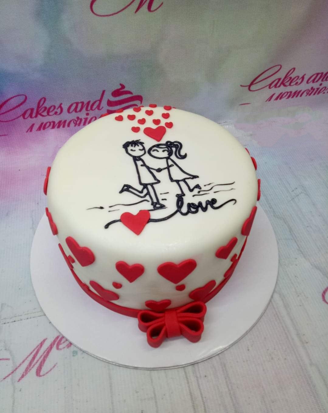 White fondant cake with a hand-drawn style couple illustration and red heart accents for a romantic occasion.