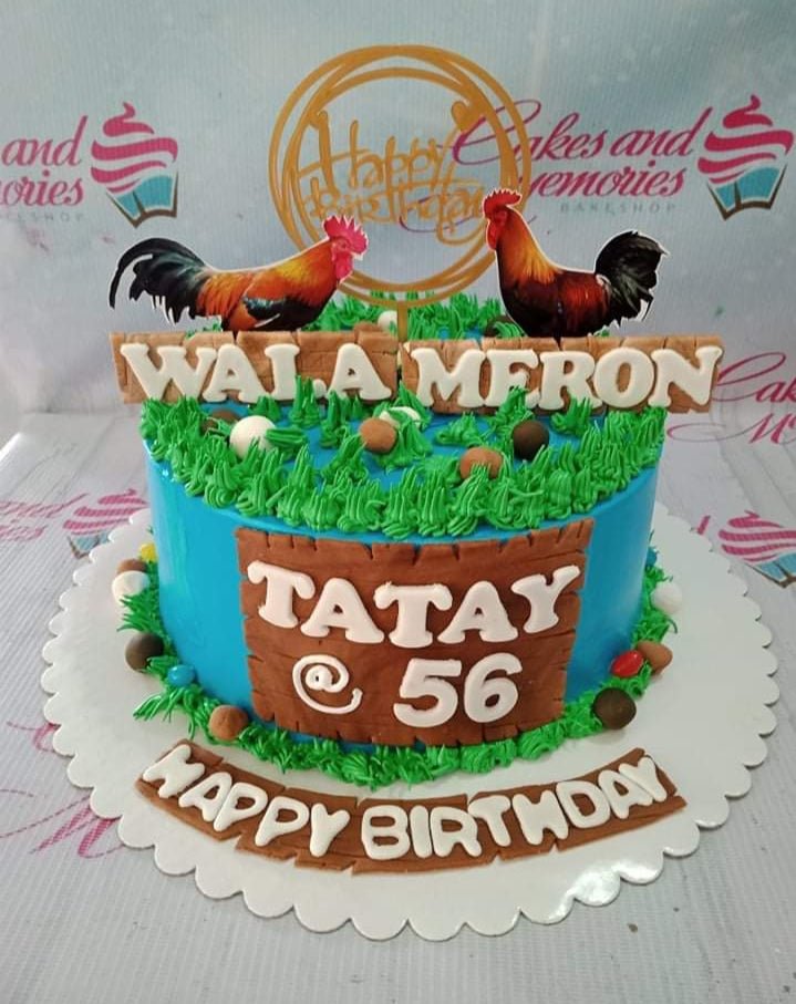 Blue birthday cake with green icing grass, rooster toppers, and a wooden fence design for a 56th birthday celebration.