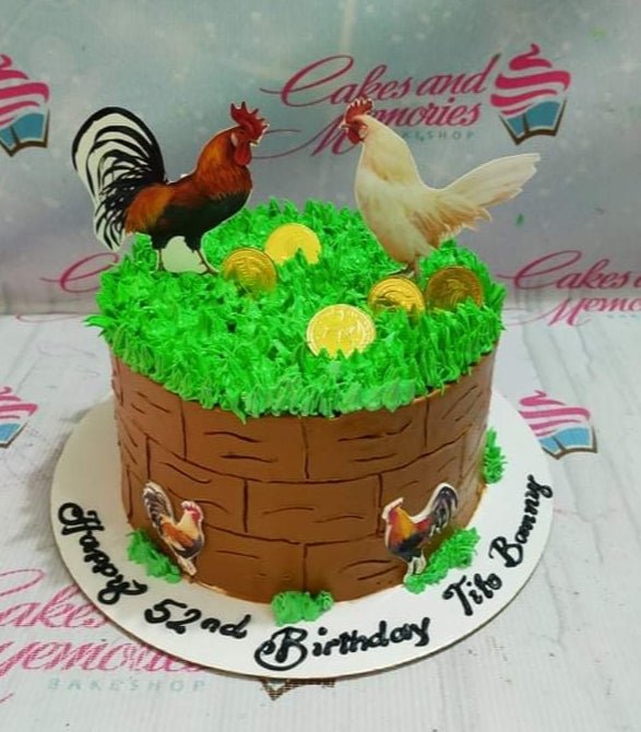 A brown basket-textured cake with green grass icing on top, featuring rooster and hen toppers and gold chocolate coins.