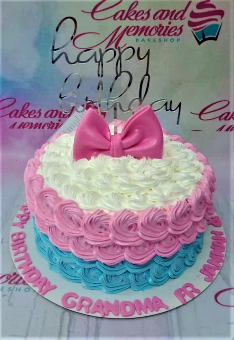 Pink and blue rosette cake with a large pink fondant bow and a silver Happy Birthday topper.