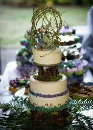 A three-tier rustic nature-themed cake with ivory icing, green moss-like textures, purple floral borders, and a twig-like arch topper with figurines.