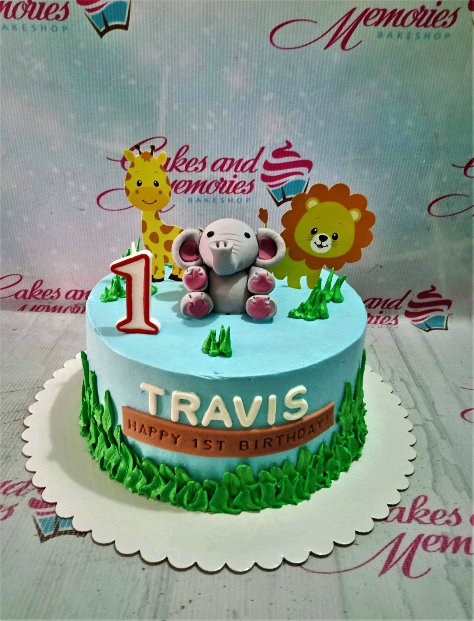 Light blue 1-tier safari birthday cake with a 3D fondant elephant, giraffe and lion printouts, and green icing grass borders.