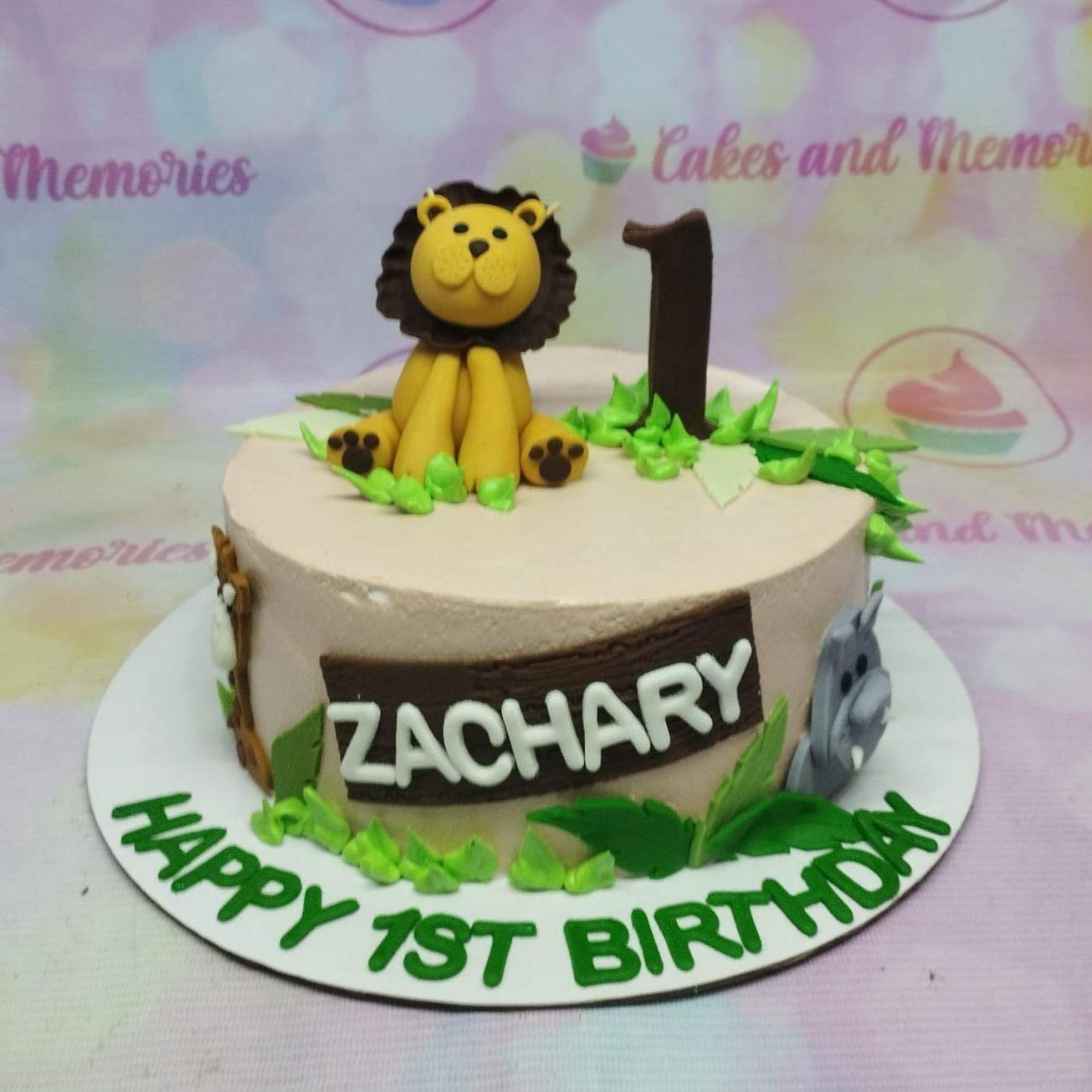 Safari themed 1st birthday cake for Zachary featuring a fondant lion, number 1 topper, and jungle leaves on light brown icing.