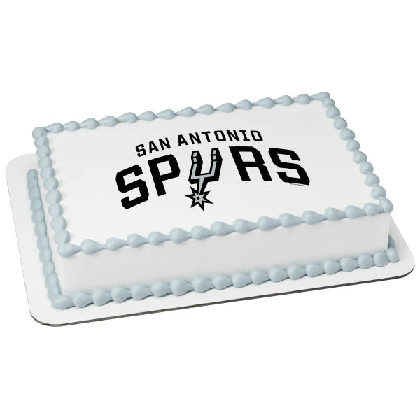 White rectangular San Antonio Spurs basketball themed cake with light blue piped icing borders and a printed team logo.