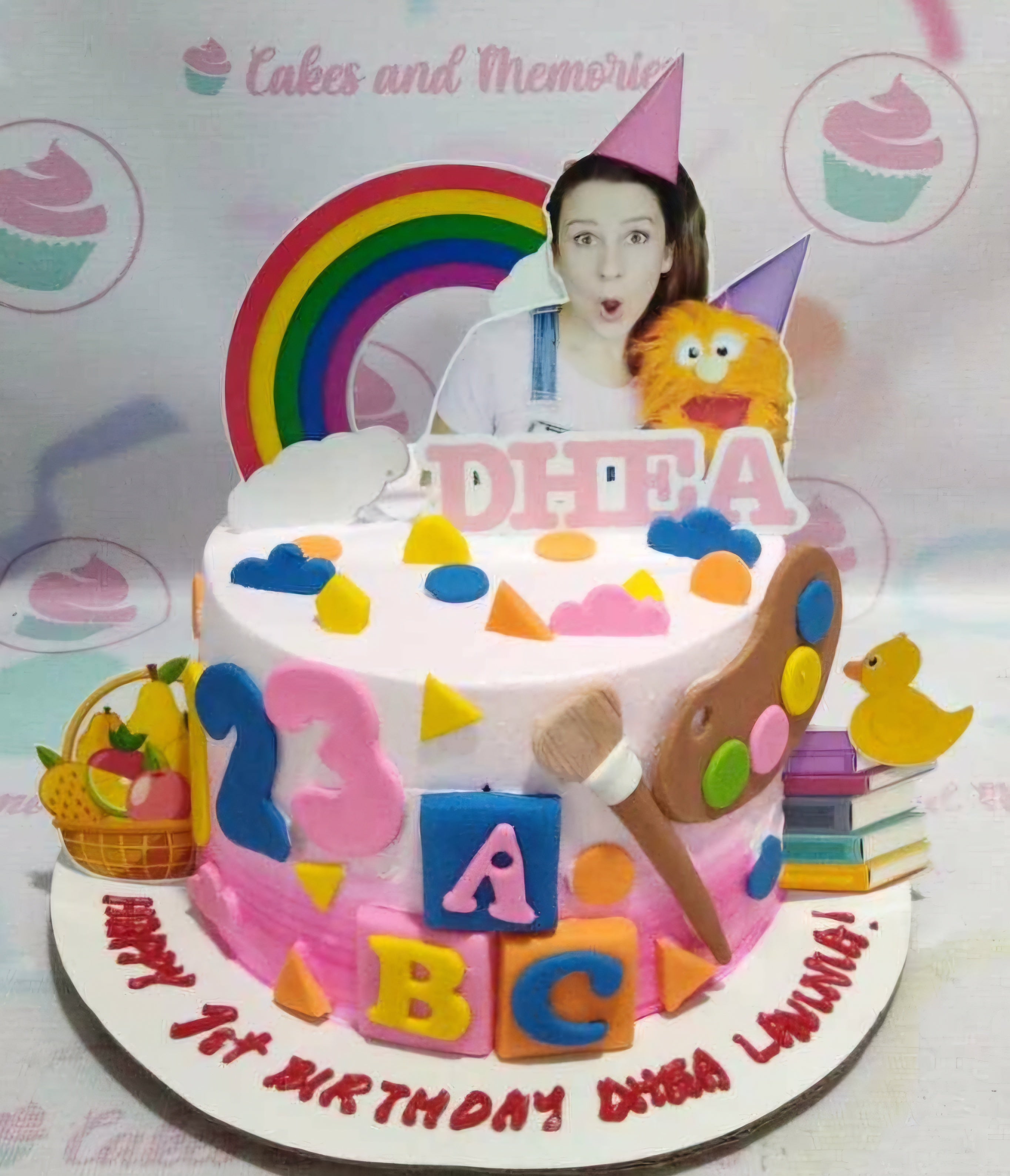 Colorful 1st birthday cake with rainbow, character printouts, and fondant school-themed decorations like ABC blocks and a paint palette.