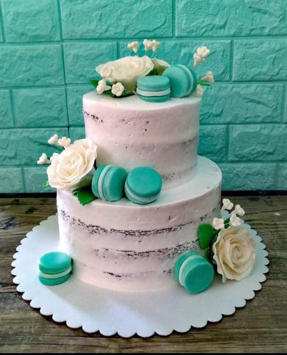 Two-tier semi-naked cake with teal macarons and white gumpaste roses on a white scalloped base board.