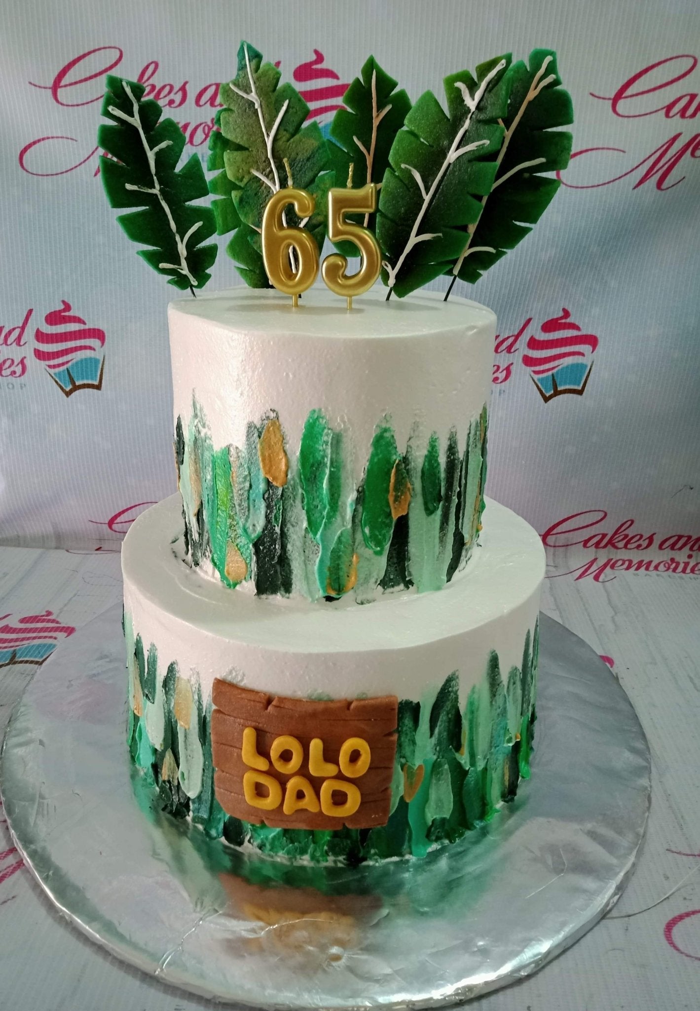 Two-tier white cake with green and gold palette knife icing strokes, tropical leaves, and gold number 65 toppers for a 65th birthday.
