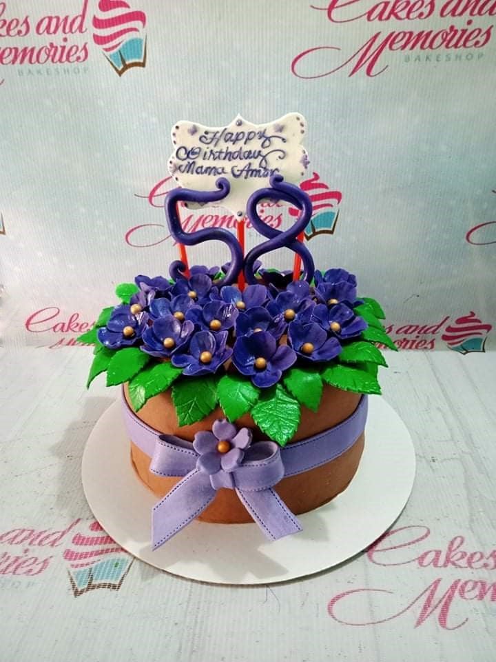 Brown 1-tier birthday cake with purple fondant flowers, green leaves, and purple number 58 toppers.