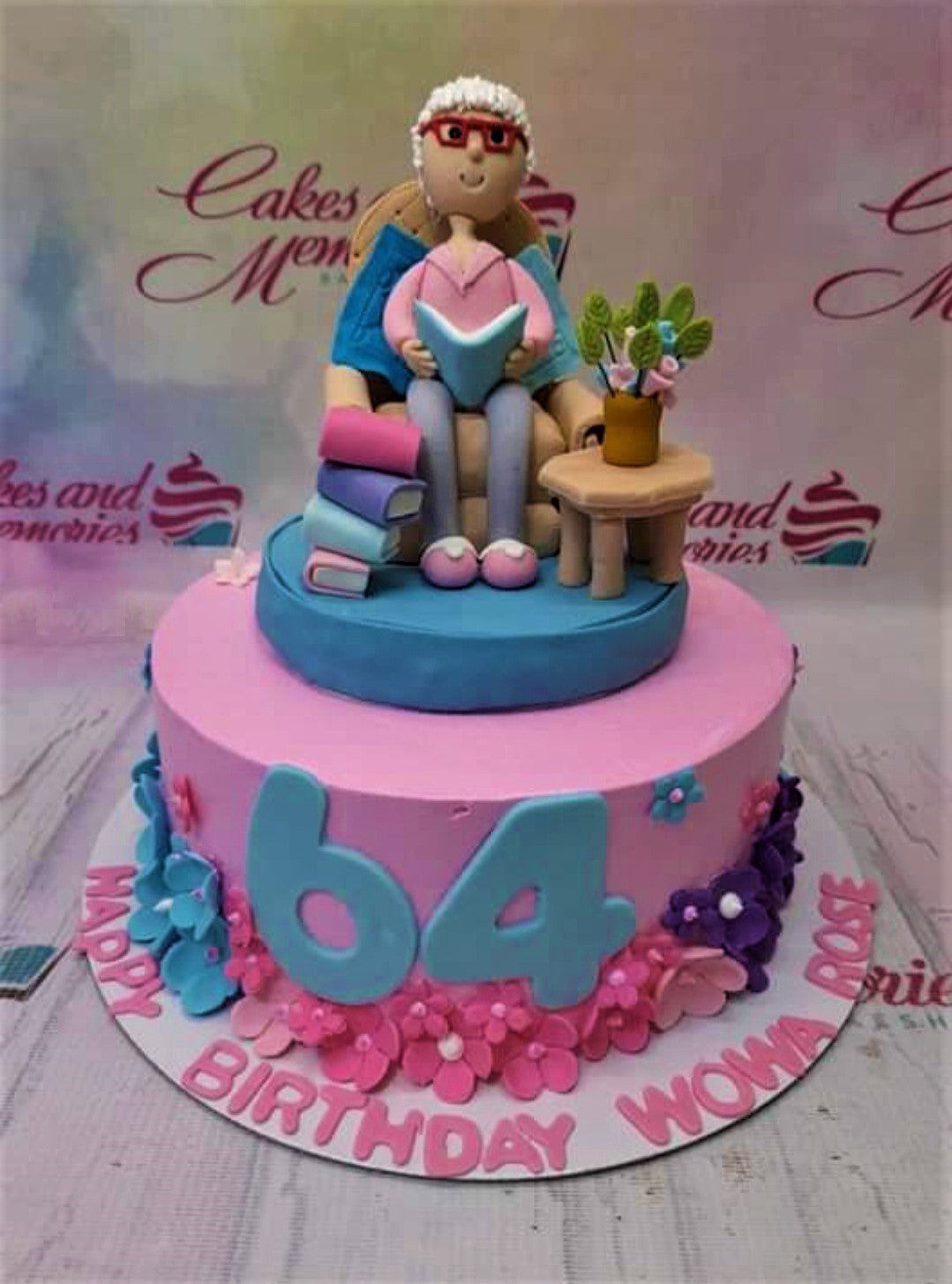 Pink fondant birthday cake for a 64th birthday featuring a detailed edible 3D figure of a grandmother reading a book in a chair.