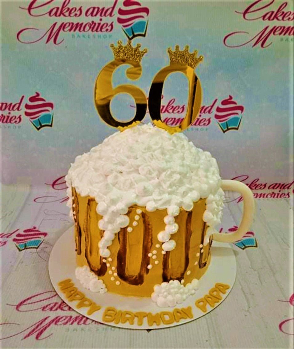 Beer mug shaped cake with white icing foam and gold metallic finish for a 60th birthday celebration.