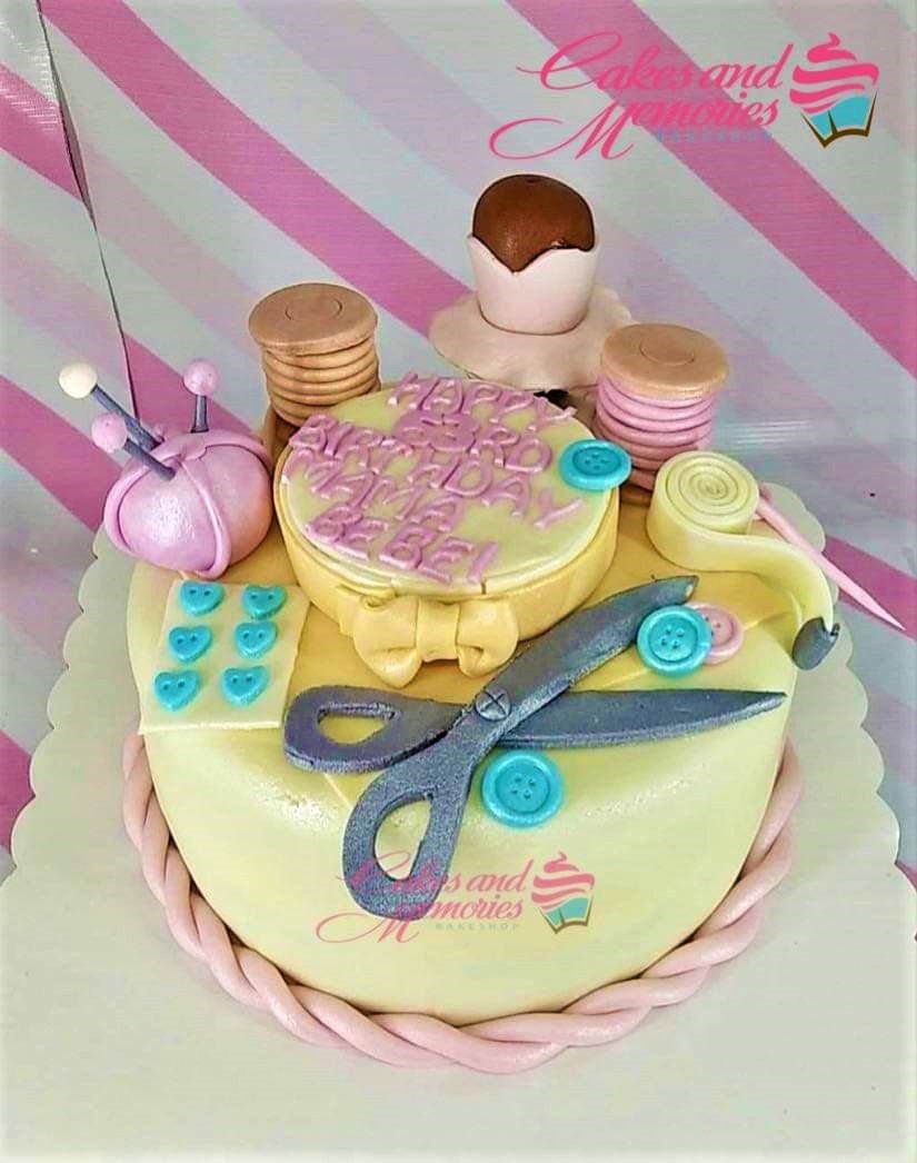 Yellow sewing themed birthday cake with fondant scissors, thread spools, buttons, and a pincushion topper.