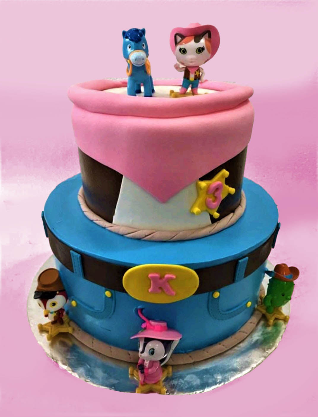 Two-tier Sheriff Callie themed birthday cake with pink bandana, blue denim jeans design, and character figurines.