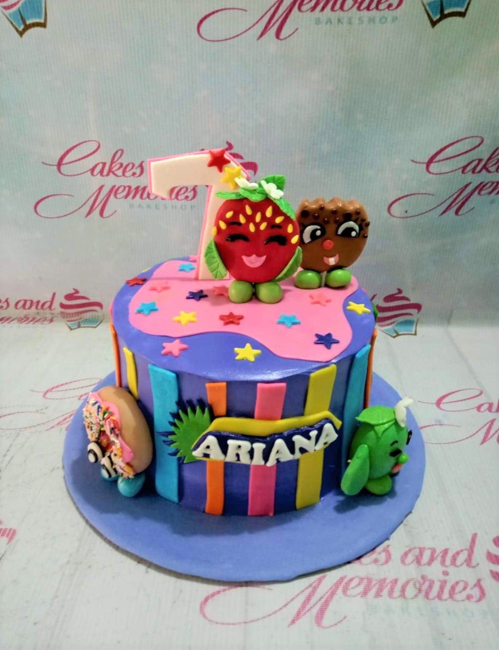 Purple Shopkins themed birthday cake with colorful fondant stripes, a pink drip effect, and edible 3D Shopkins characters on top.