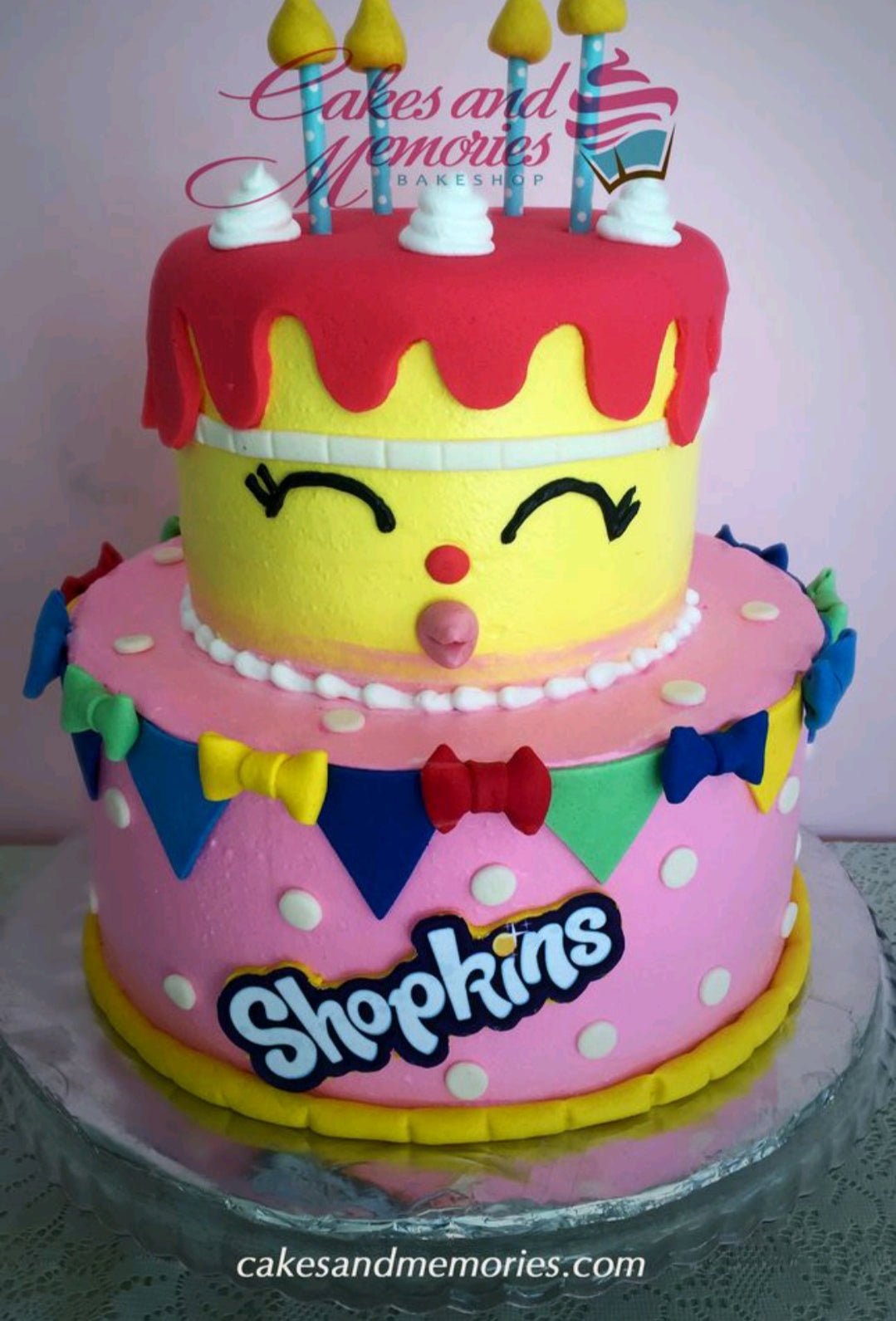 Two-tier Shopkins themed birthday cake with pink and yellow icing, fondant bows, and colorful bunting decorations.