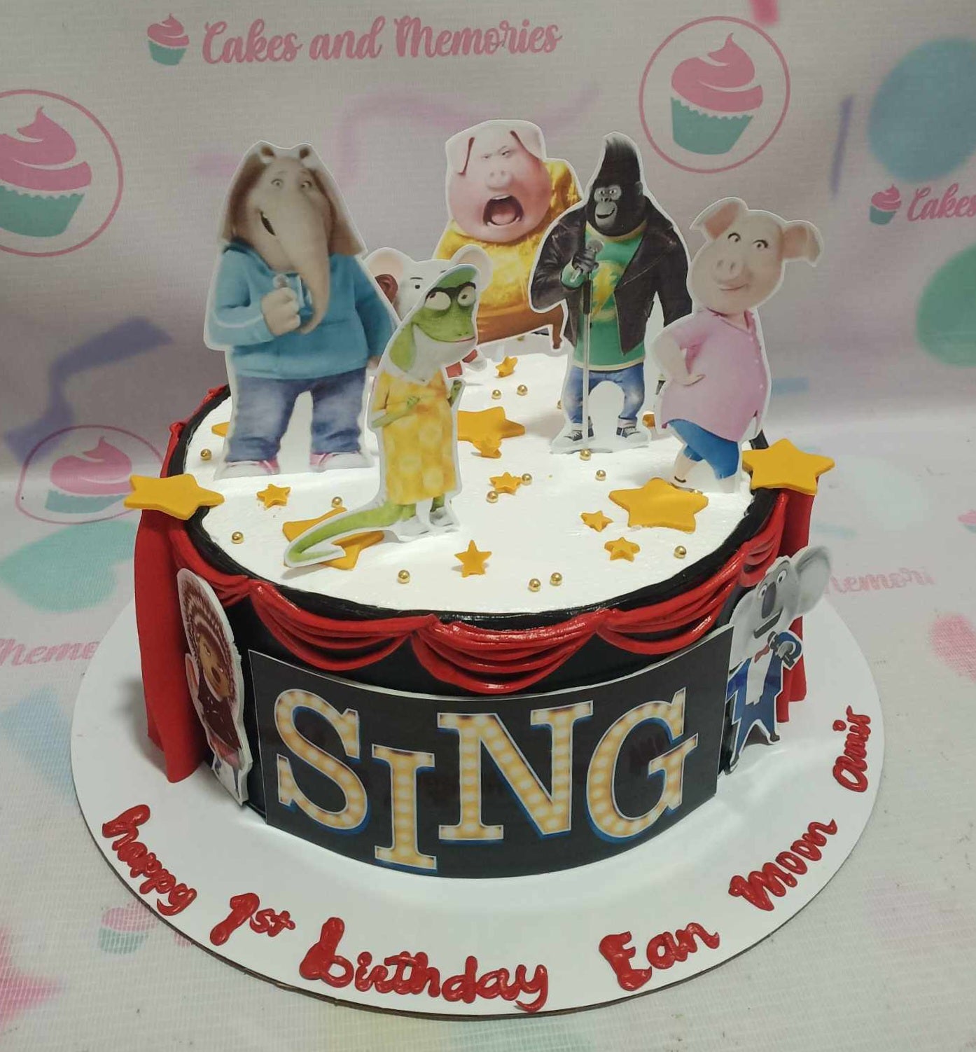 Sing movie themed birthday cake with character printouts, red icing drapes, and gold stars on a black and white base.