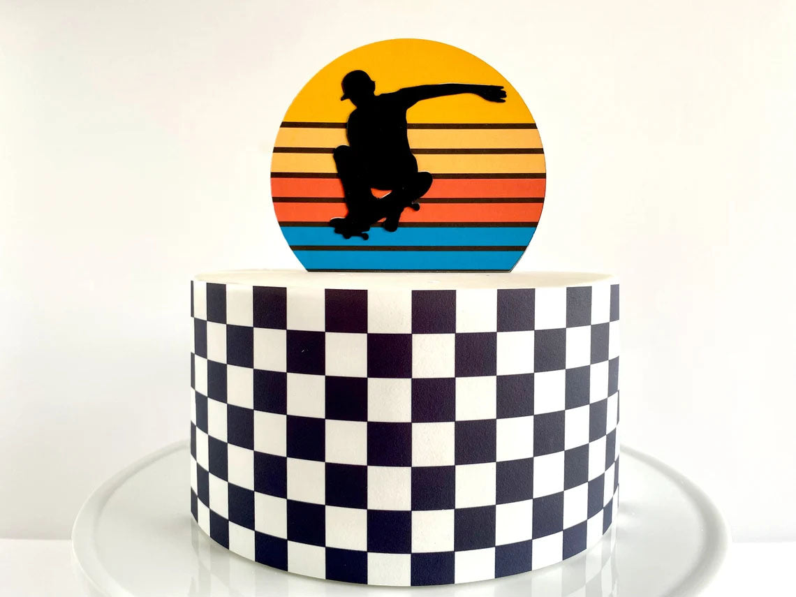 Single tier white fondant cake with a black and white checkered pattern wrap and a sunset skateboarder printout topper.