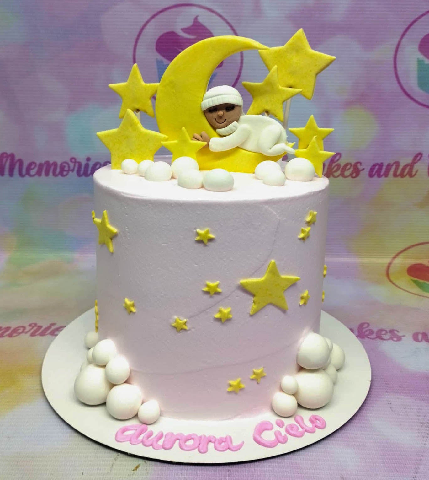Light pink birthday cake with a sleeping baby on a yellow moon topper, surrounded by yellow stars and white fondant clouds.