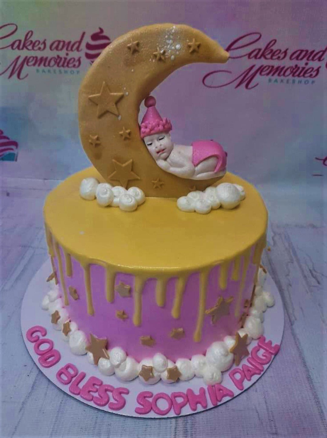 Pink 1-tier baby shower cake with a sleeping baby on a gold crescent moon topper, yellow drip, and white icing clouds.