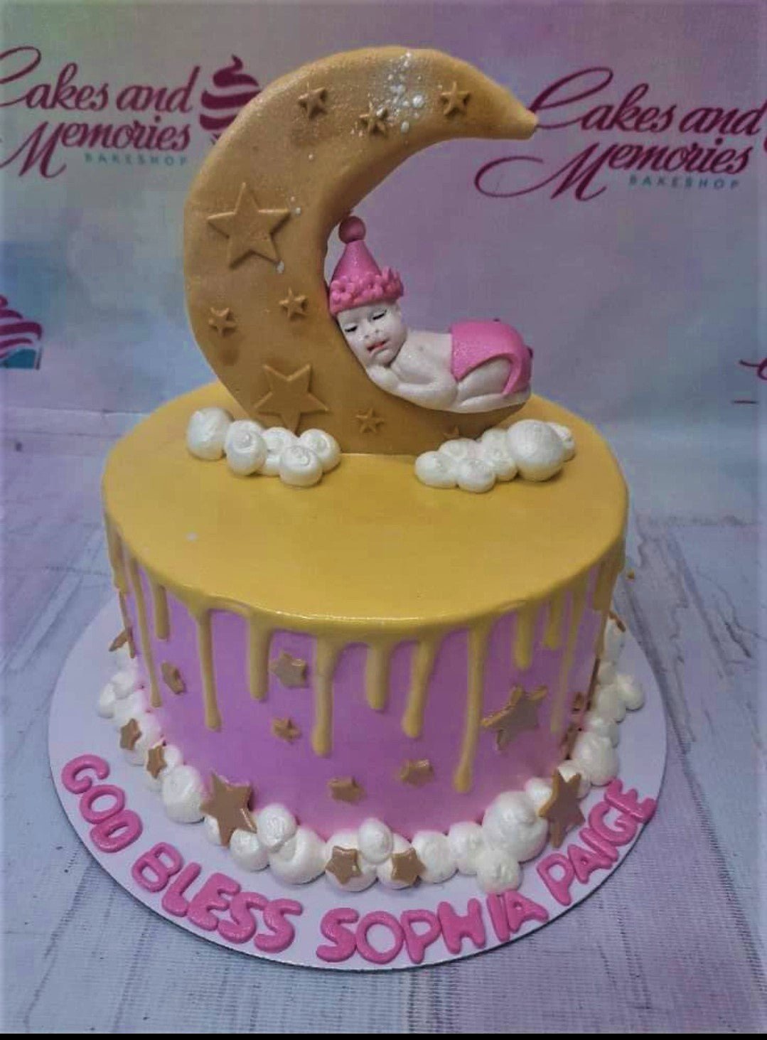 Pink and yellow baby shower cake with a large fondant moon, sleeping baby figure, and white icing clouds.