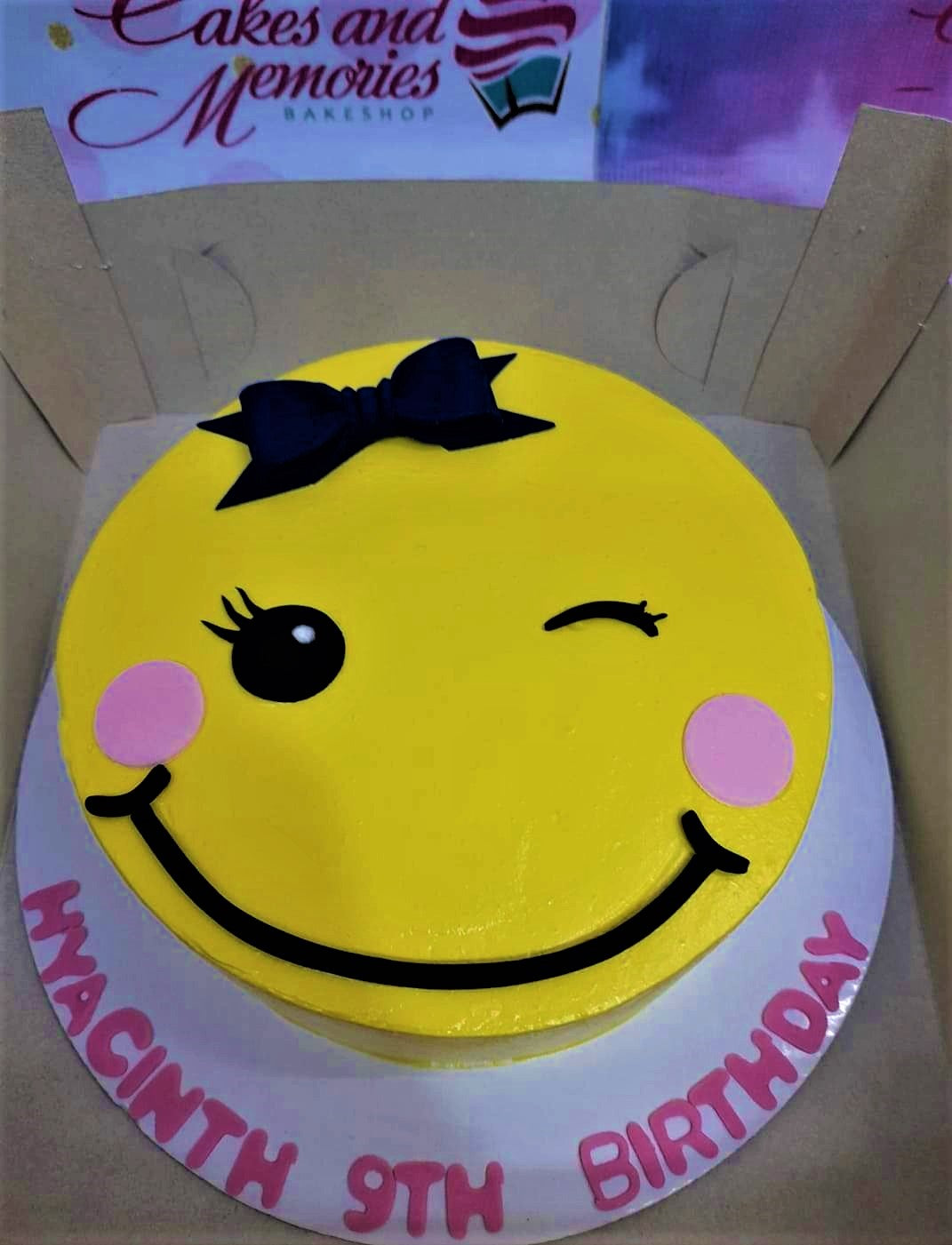 Yellow smiley face birthday cake with a black bow, pink cheeks, and a winking eye design.