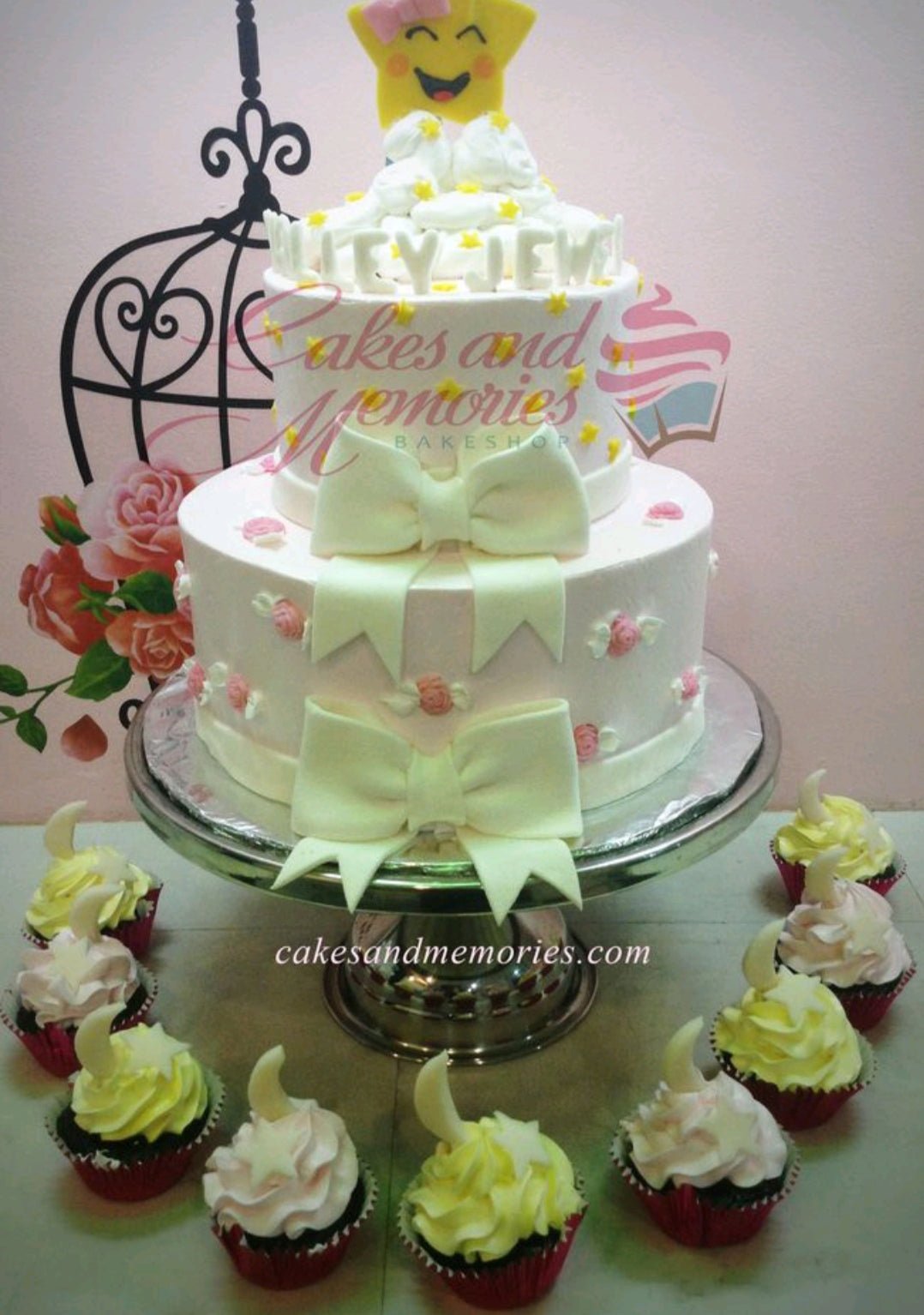 Two-tier white soft-icing cake with large white fondant bows, pink icing rosettes, and a smiling yellow star topper.