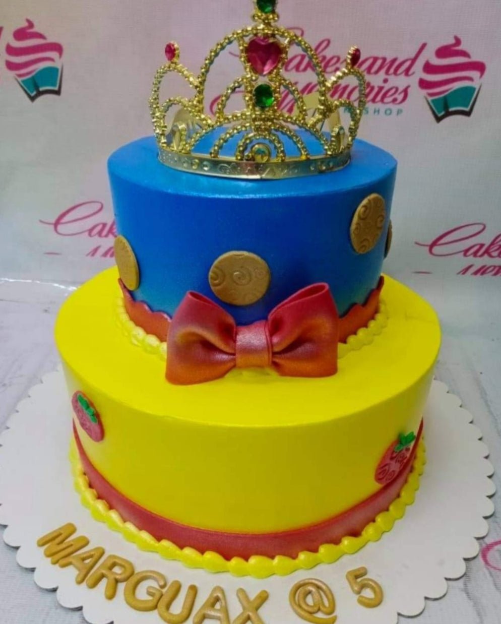 Two-tier Snow White themed cake with a blue top tier, yellow bottom tier, red bow, and a gold rhinestone crown topper.