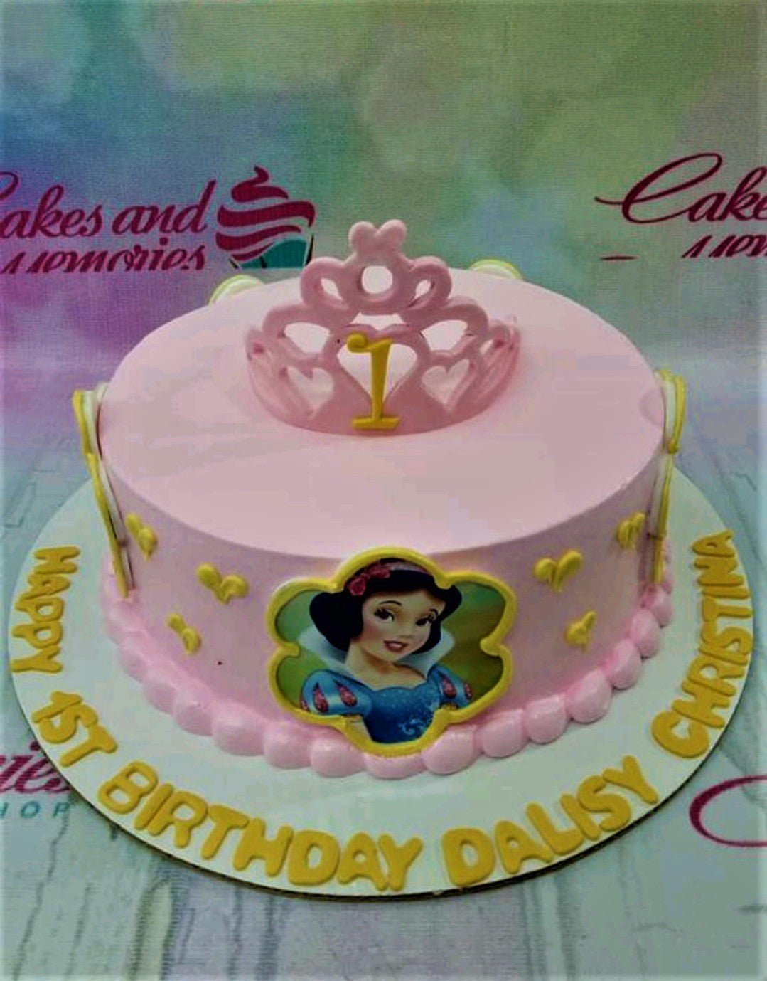 Pink Snow White themed birthday cake with a pink tiara topper and yellow icing hearts.