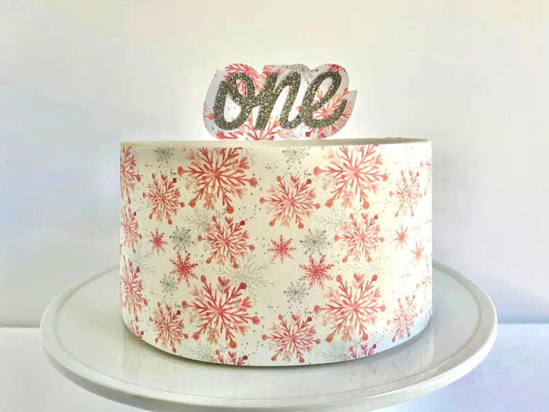 White single tier cake with red and silver snowflake patterns and a glittery 'one' topper.