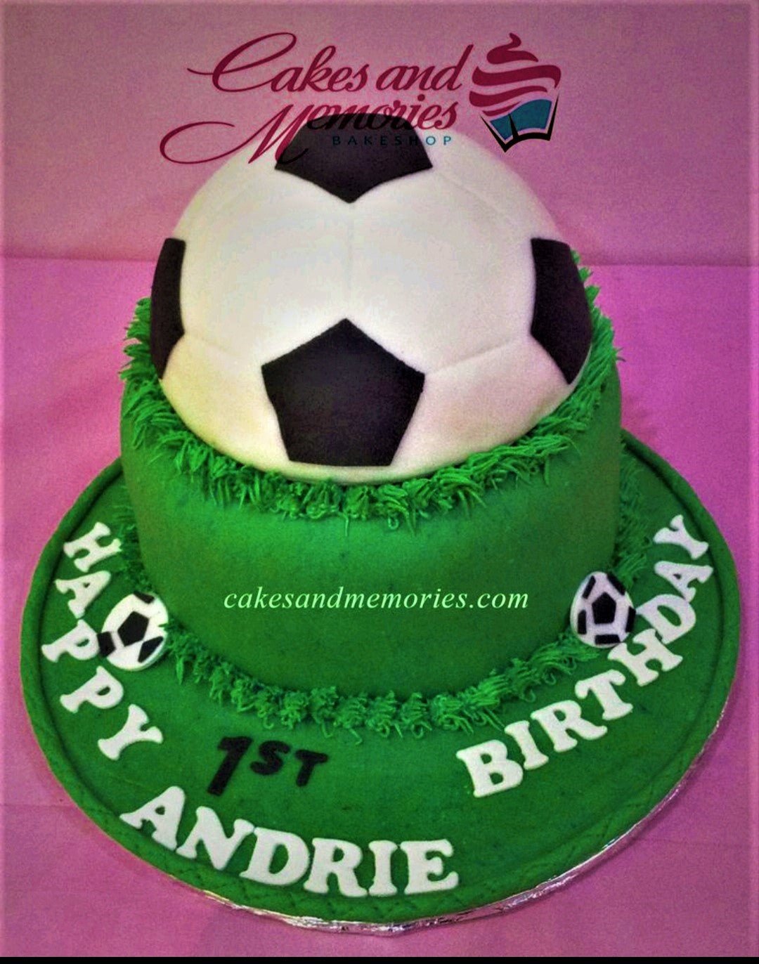 Soccer ball themed birthday cake with a large 3D soccer ball topper on a green grass-textured base for Andrie's 1st birthday.